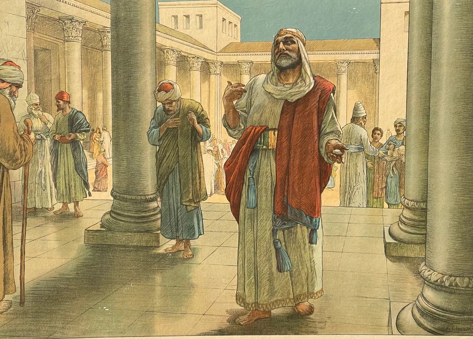 Hristos S-a schimbat la Fată pe Tabor, S-a rugat pe colina Ghetsimani, S-a răstignit pe înălţimea Golgotei. Sfântul Maxim Kavsokalivitul a primit Harul pe vârful Athonului. In biserică suntem chemaţi să ne ridicăm din cele pământeşti, să stăm mai presus de cele stricăcioase şi vremelnice, să respirăm aerul înnoitor şi transfigurator al veşniciei. Să pătrundem într-o altă atmosferă şi într-un alt duh, pentru a înfrunta întâmplările şi problemele dureroase şi obositoare de zi cu zi. Doi oameni, doi bărbaţi, fără vârstă şi nume, două tipuri caracteristice, am zice, care putem fi oricare dintre noi, intră în templu. Merg să se roage. Este vorba despre o lucrare sfântă, o mişcare spontană a inimii, un act dintre cele mai sfinte ale vieţii. Pesemne că nu era vremea slujbei. Nu par a fi fost înţeleşi dinainte. Fiecare s-a dus singur. Unul este fariseu, iar celălalt vameş. Nu este nevoie să spunem mai multe despre ei. Toată lumea ştia foarte bine ce însemna un vameş şi cine erau fariseii. Pe atunci, vameşii erau strângătorii dajdiei pentru templu şi asupreau fără milă norodul, cerând sume exagerate, din care îşi trăgeau şi un câştig personal. Fariseii constituiau elita spirituală şi se dădeau drept oameni din cale-afară de evlavioşi, drepţi, cumsecade şi foarte de ispravă.